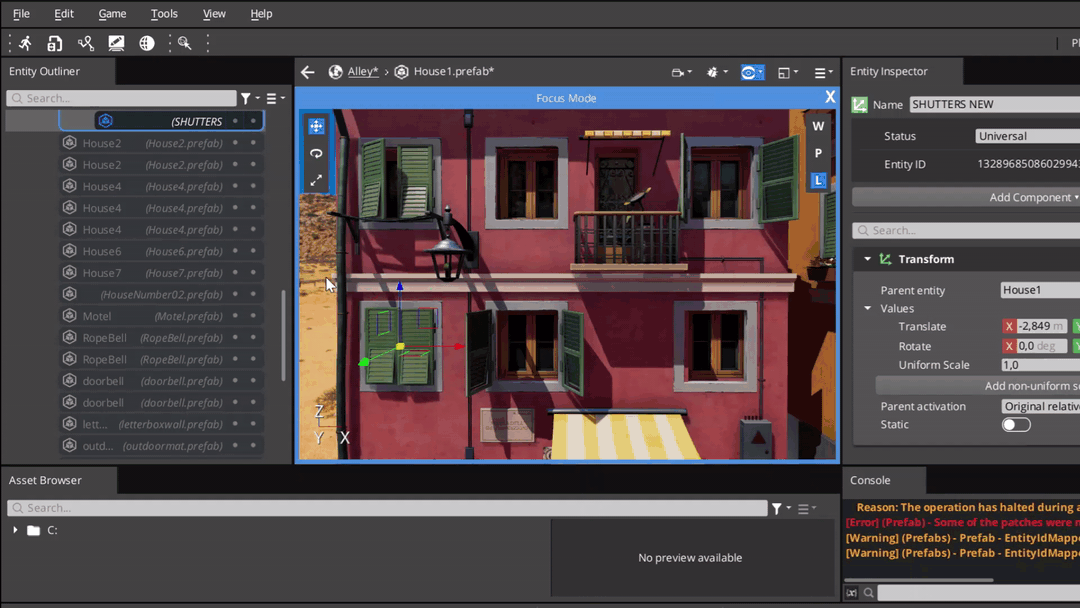 Prefabs are easy to create in O3DE: you do it by right-clicking on an entity – you then have to decide where to store it in your project. You then simply access them from the “Asset Browser”, copy them and edit them from the viewport or the outliner by double-clicking on them. You can now reflect your changes from one prefab to all the instantiated copies with just a couple of clicks!