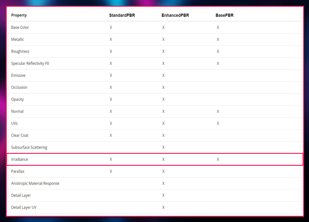 For example, when creating a new PBR material, O3DE allows you to choose between different shaders, each one supporting a different variety of features and texture maps. This way you can decide which one better suits your needs. One thing I want you to notice between these different versions of PBR materials in O3DE is that all three of them offer support for “Irradiance”.