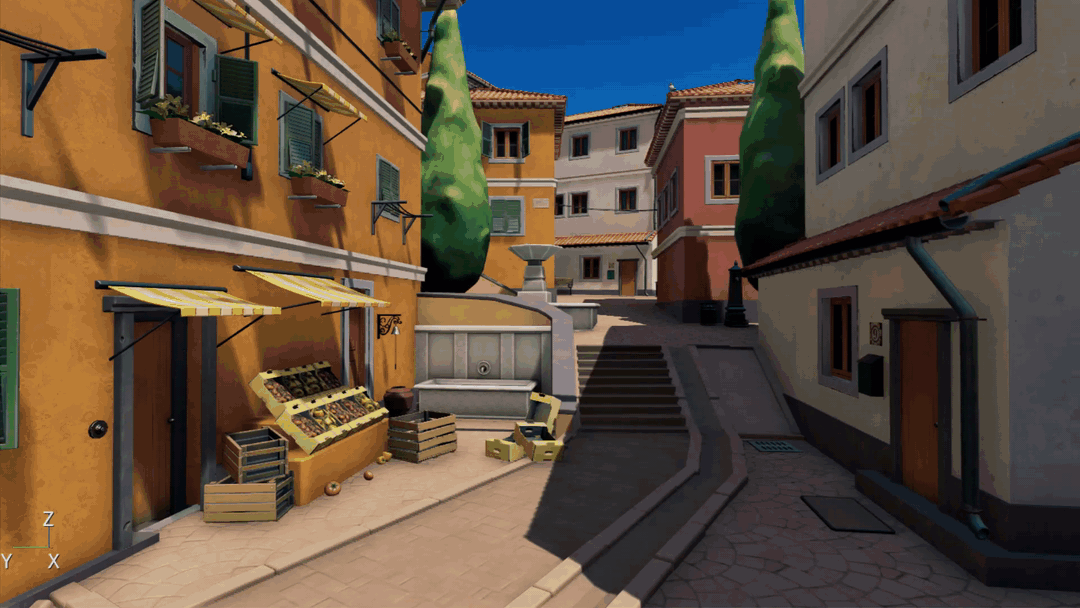 I can never stress enough how important it is for developers to have clear ideas starting from day one of a project. Making a demo or videogame is an arduous process, so you must have a concrete vision from the very early stages to get a good result. This means understanding the purpose of your project. For example, the main goal of our demo was to show how by using ray traced GI, vibrant colours diffusing from objects can dynamically affect the surrounding environment lighting and nearby entities in real-time That’s how we came up with the idea of creating a small Italian-like village with colourful houses.