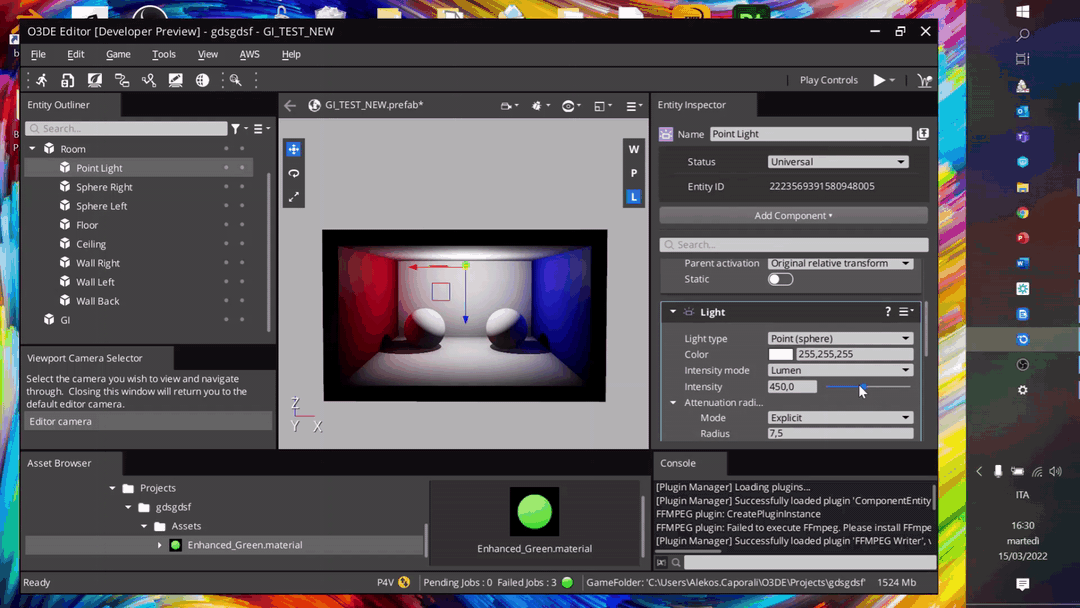 We discovered that the engine can use ray tracing to dynamically compute GI in real-time, so we decided to use this as the main feature for our upcoming demo. From there, a strong collaboration with AWS developers started, and we helped each other; we tested the engine and provided continuous feedback to the developers and based on this feedback they implemented some missing features.
