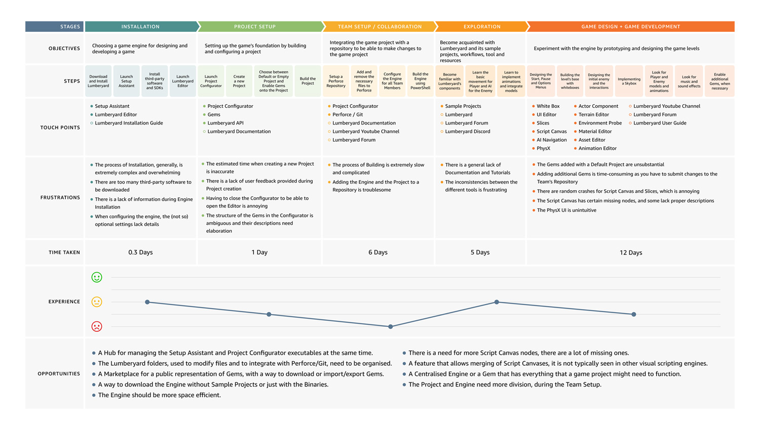 This is where I came into the picture. Along with three other interns, I had the opportunity to work on a month-long Game Jam to learn about Lumberyard. Since we had never used the engine before, we provided our objective feedback for its FTUE. I was able to collect the issues with a diary study and provide my findings to all the other stakeholders. From that diary study, we learned how first-time users used Lumberyard, what their major blockers were, and how these issues occurred. We then generated a list of areas for improvement based on these research findings. Through this initiative, we considered the goals and frustrations of users, and assessed the User Journey Map shaped by the most common FTUE workflows within the engine: Installation, Project Setup, Team Setup, Engine Exploration, and Game Design + Development.