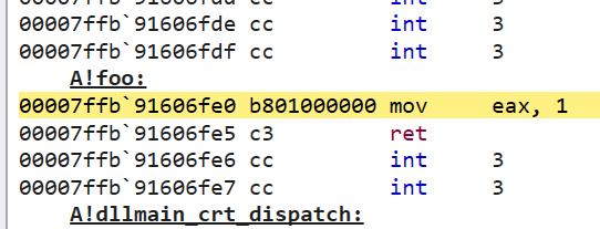 The addresses for calling foo and bar are emphasized here. The first call to foo is visible since it sets eax to 1 and returns again. To verify that the second highlighted address takes us to the bar thunk, we can dump the imports of main using dumpbin /imports main.exe: