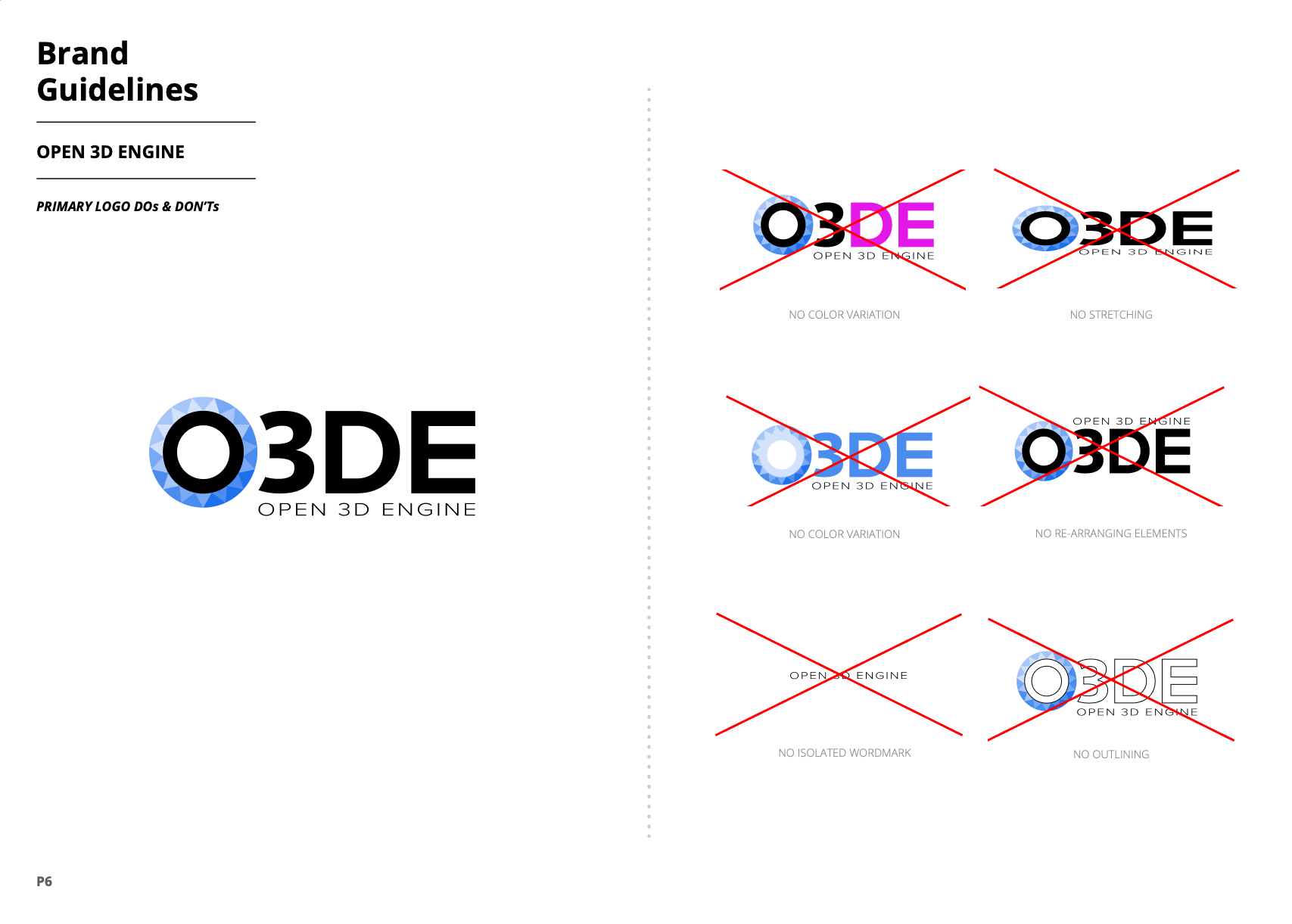 This is a PDF for O3DE’s brand guidelines. It contains details on our primary and secondary logos, various other brand assets, and instructions for correct applications of the O3DE Logo. It also has a breakdown of our color palette if you are interested in developing marketing materials that showcase a product using O3DE.